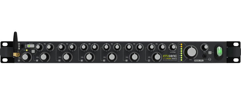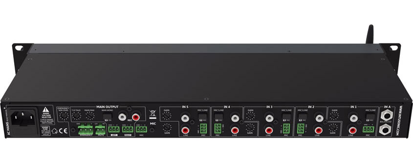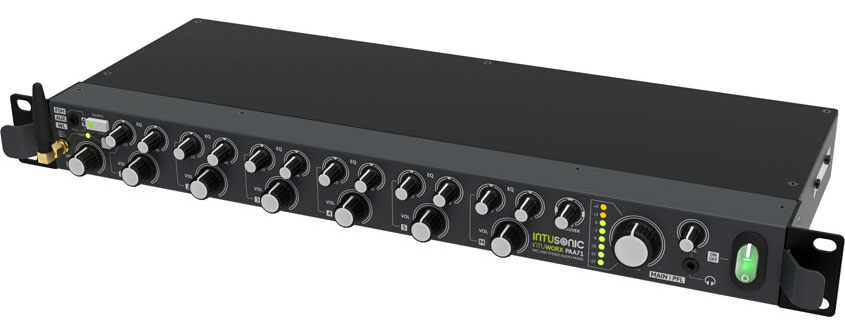 The INTUWORX™ PAA71 is 7-channel mic/line mixer and the perfect centre of any installed sound system. It offers 5 multi-purpose inputs which can either be fed with a balanced microphone signal or an unbalanced stereo line signal. One further balanced stereo line level input is specifically useful for sources at larger distance, like a mixer on a stage, or the output of a different room’s system. The same input can be switched to receive its input signal from the 3.5mm TRS jack on the front, or the built-in LINKOUSTIC™ 4.2 wireless audio link. An additional dedicated microphone input with adjustable talkover (priority) provides control over announcements. Every input – with the exception of the balanced stereo input – is equipped with rear-panel gain control and a front-panel 2-band equalizer. The external shutdown and emergency signal input connections allow integration with central announcement and evacuation systems where required.